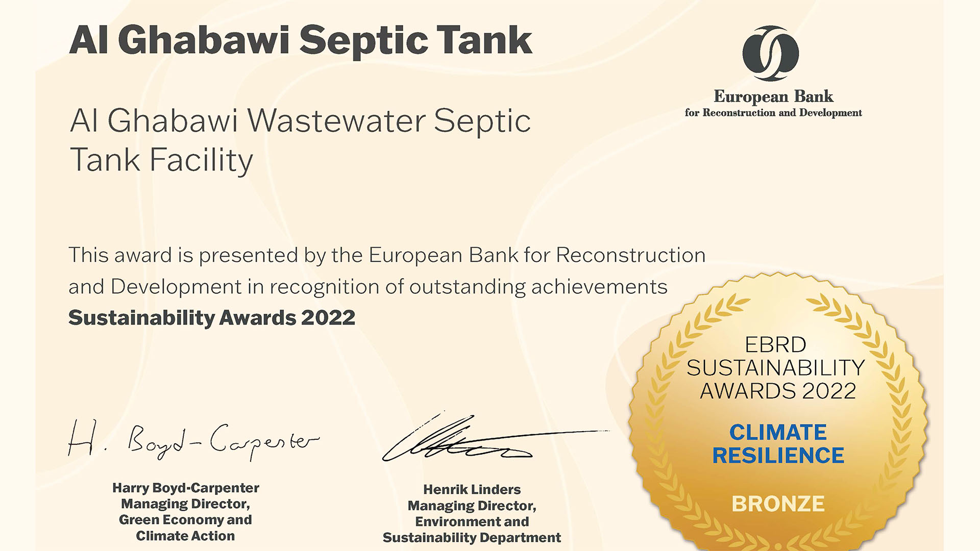 Al-Ghabawi WWTP project awarded the EBRD Sustainability Award for Climate Resilience